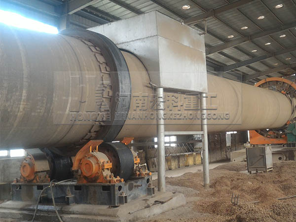 圓筒形的主窯體與水平呈3°左右的傾角放置在托滾上。物料在高的一端進入窯內(nèi),在窯體做回轉(zhuǎn)運動的作用下, 物料從高處(窯尾)滾落至低處(窯頭),同時,在窯頭處,高壓風機將煤粉(或天然氣等其他燃料)噴入窯內(nèi),并使其充分燃燒,產(chǎn)生的熱量使物料發(fā)生物理和化 學變化,產(chǎn)生膨脹現(xiàn)象,冷卻后既為陶粒。